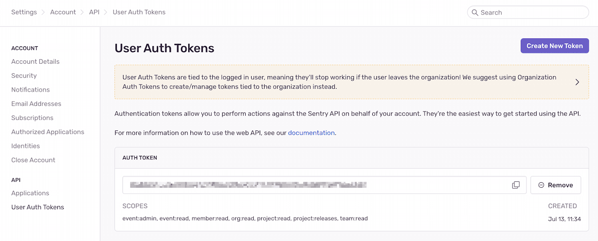 User Auth Tokens should be used to interact with the Sentry API on behalf of a user. For example, to fetch all issues for a user, you would use a user auth token. We don't recommend using user auth tokens for CI tasks because if the user who created the token is removed from the Organization, the token will stop working.