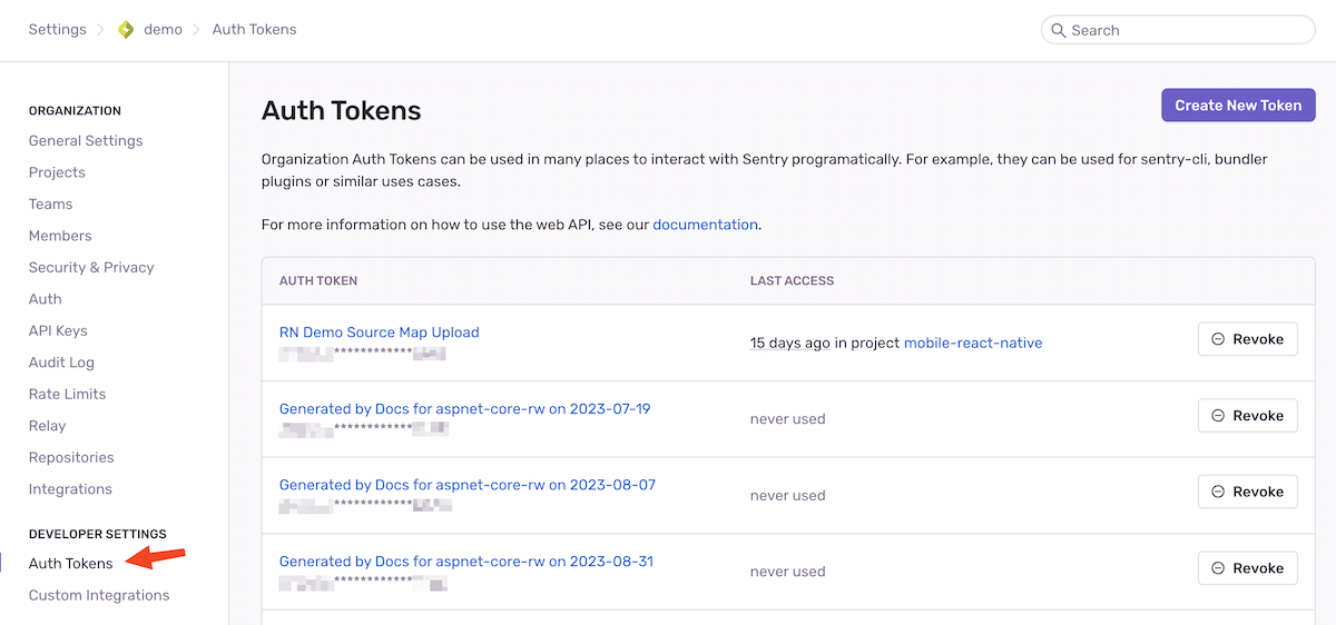 We recommend using a separate auth token for each use case. For example, you would use a different auth token to upload source maps than the one you use with Sentry CLI. This has the benefit that if an auth token is compromised, you can revoke that auth token without impacting the rest of your workflow.