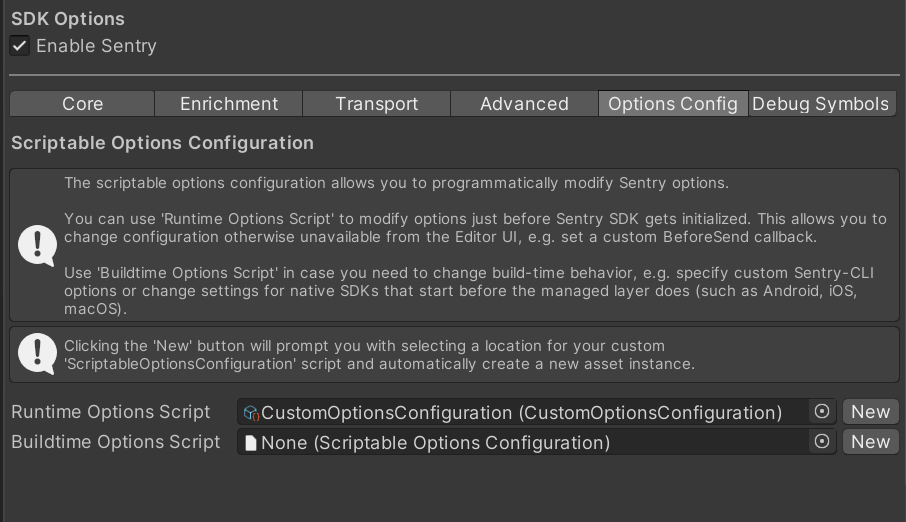 • Runtime Options Script is executed on each app startup, right before the managed Sentry SDK is initialized (except for Android, iOS, and macOS native layers, which are already set up by that time). An example of how this can be used is for implementing your own filtering of events using the BeforeSend callback. (This callback only runs for events coming from C# scripts.)
