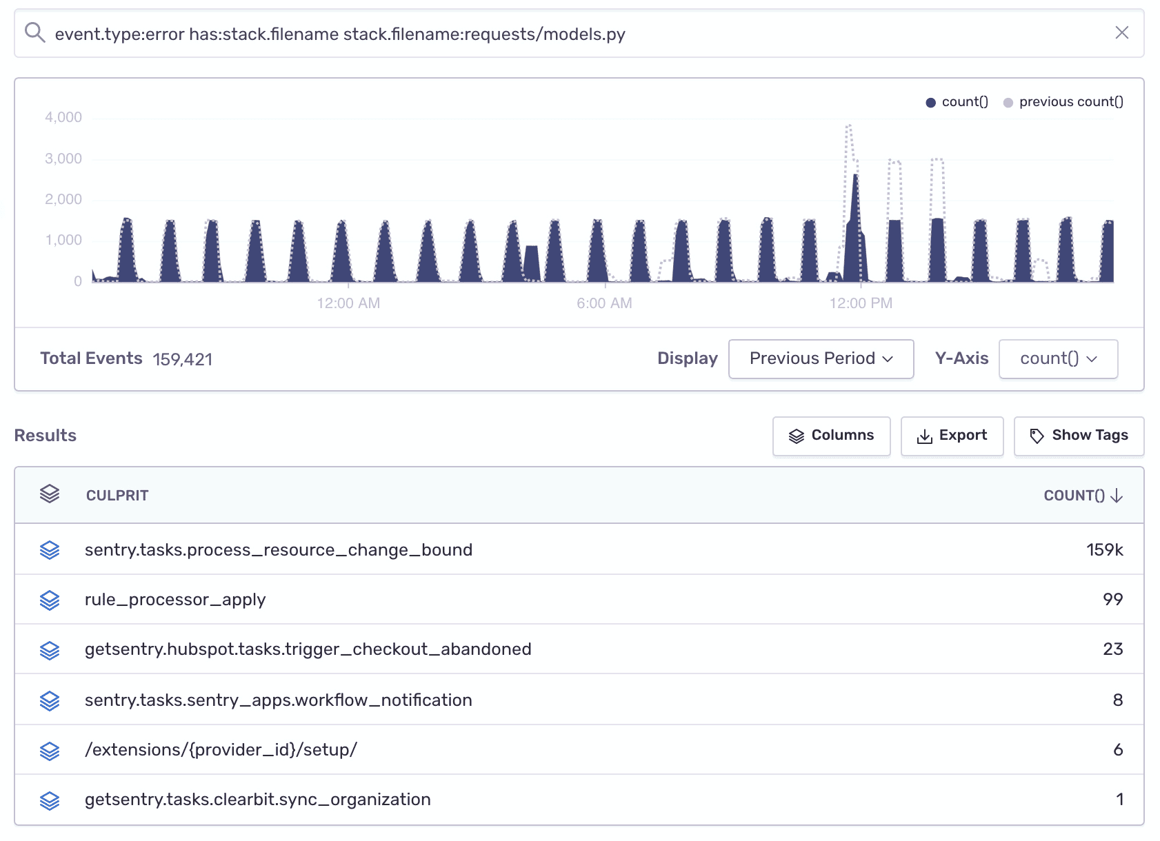 Sentry notifies you in real-time when your application breaks, and then provides the information and tools to triage and resolve the error. With Discover, you can take a more proactive approach to find the major issues that break your apps. Building that query might look like this: