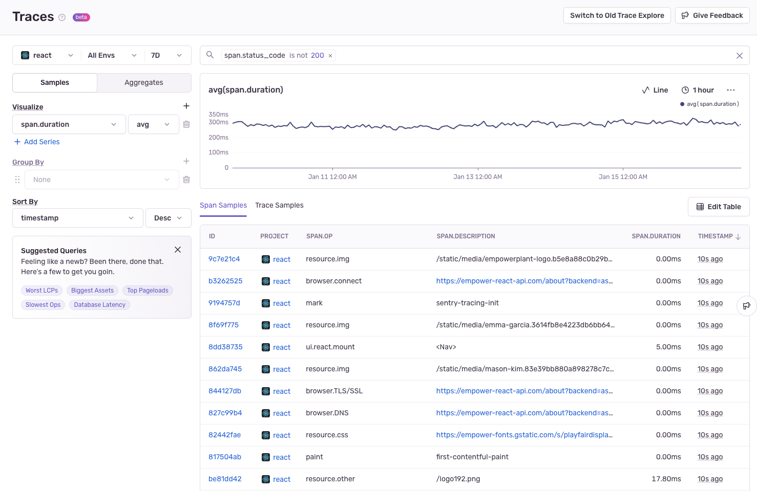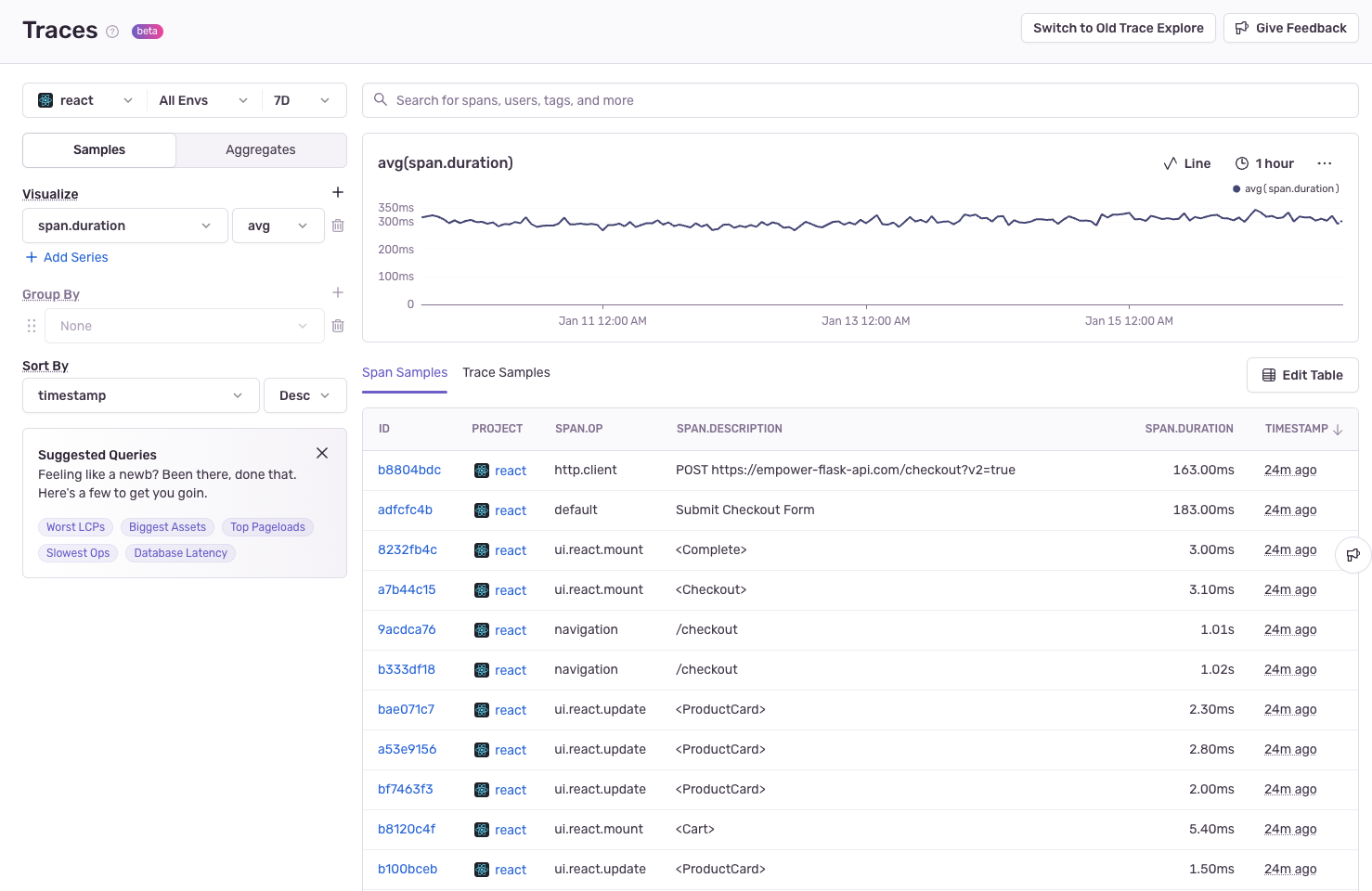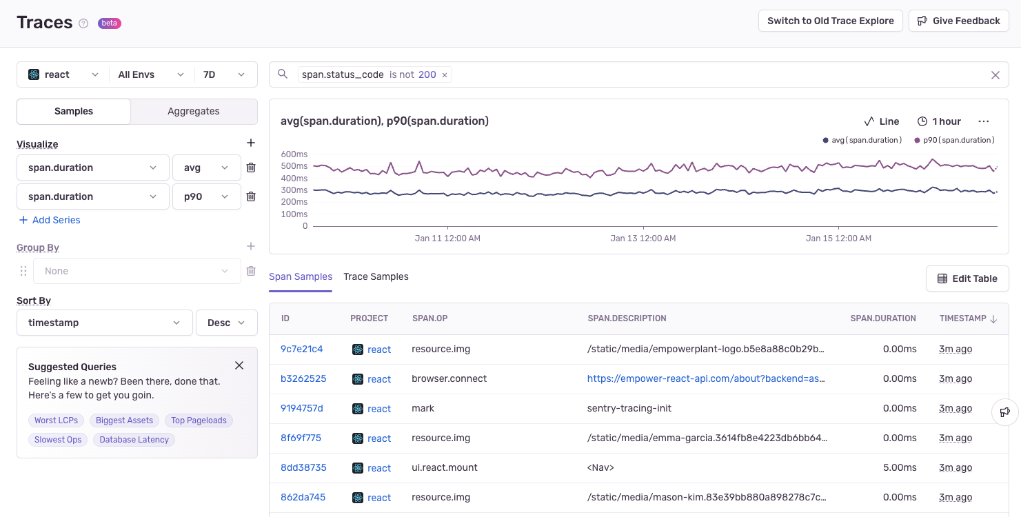 The Trace Explorer in Sentry is designed to make investigating performance issues easier and more intuitive. You can now explore span samples, visualize span attributes, and aggregate your data with flexible queries and filters. This guide will walk you through the key concepts and features of the Trace Explorer.