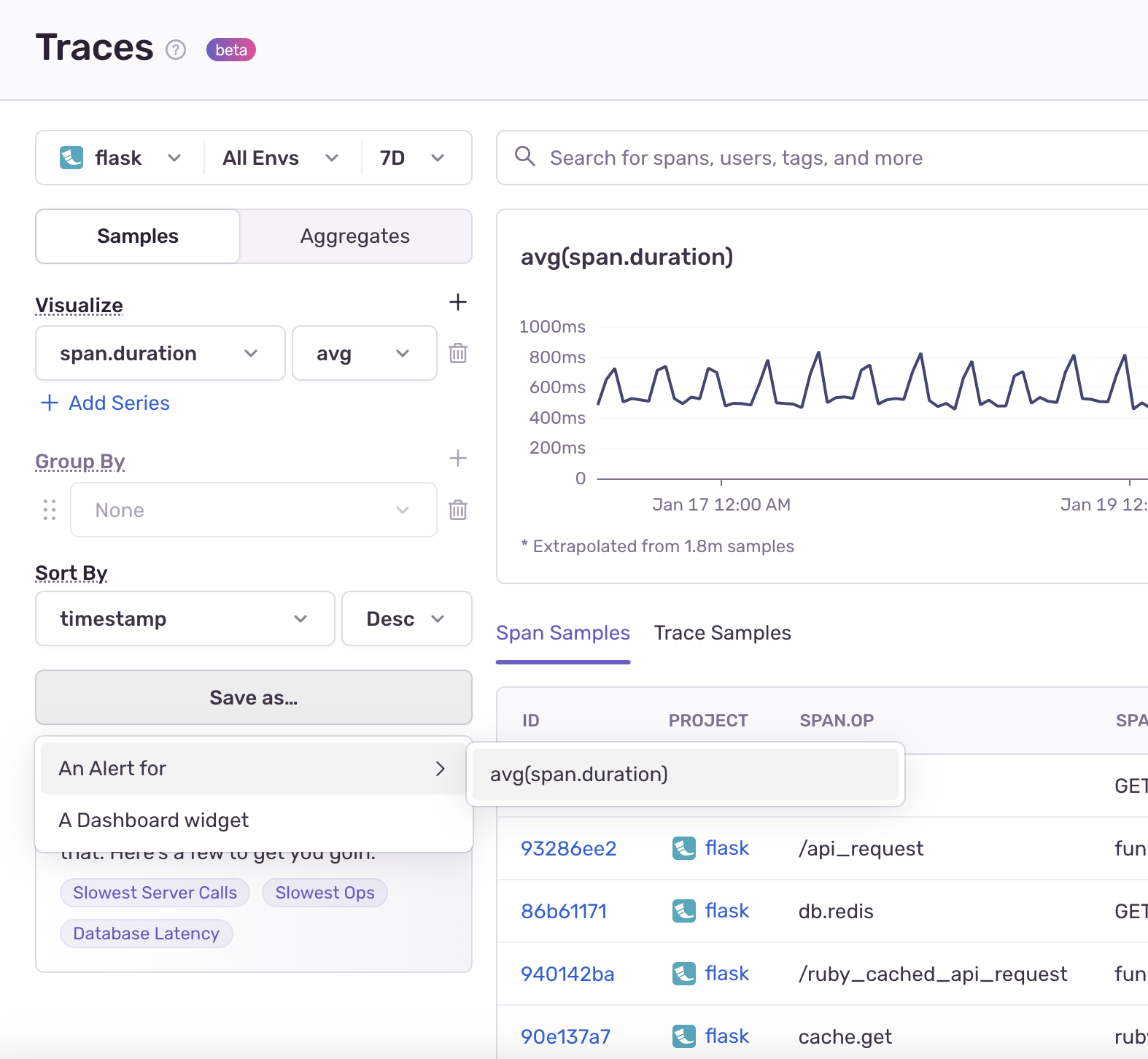 - You can switch between Span Samples and Trace Samples tabs depending on your focus.