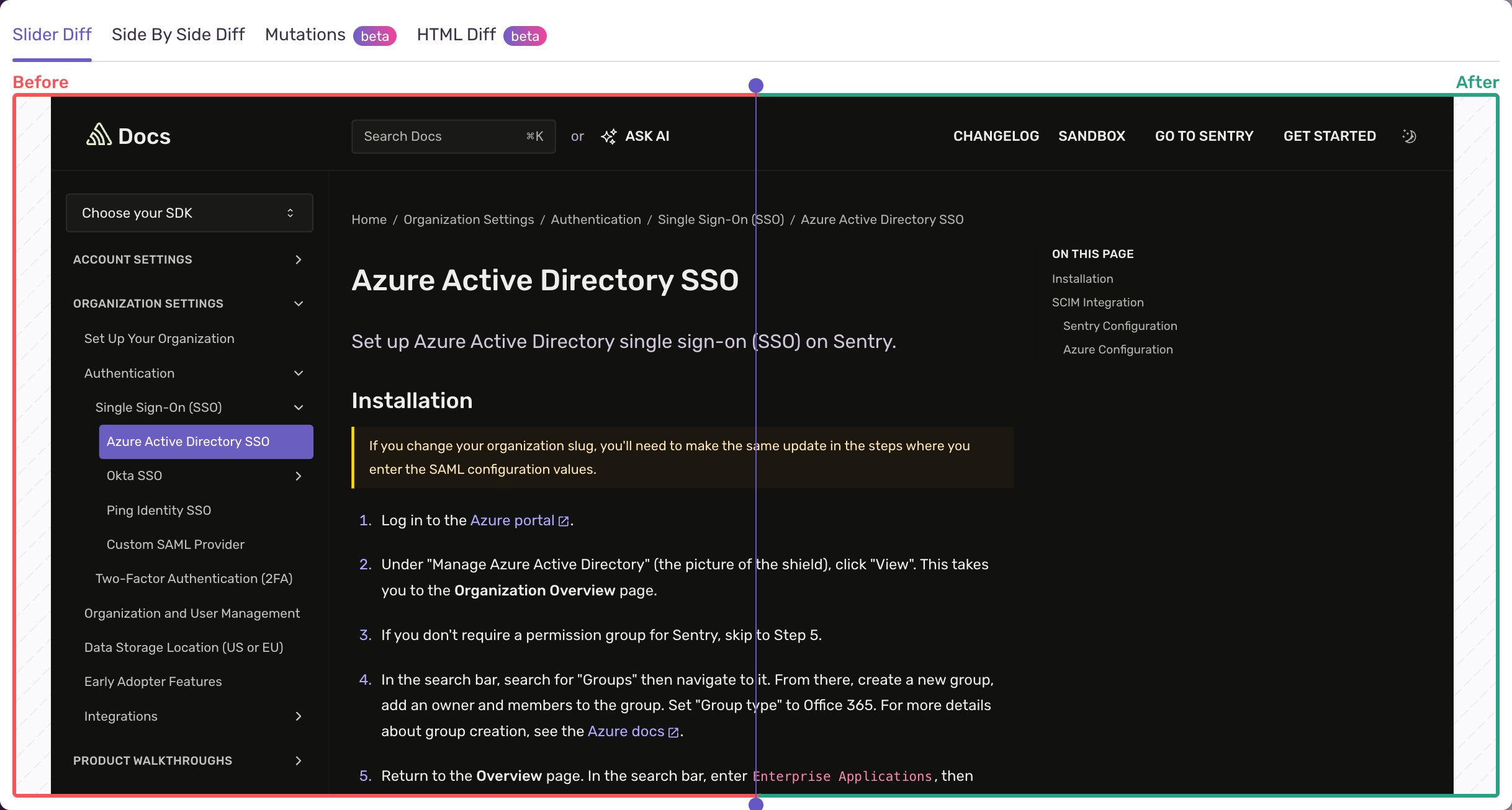 The image slider tool allows for comparing the two page states by overlaying the images on top of each other. Click and drag the purple line to reveal one image or the other.