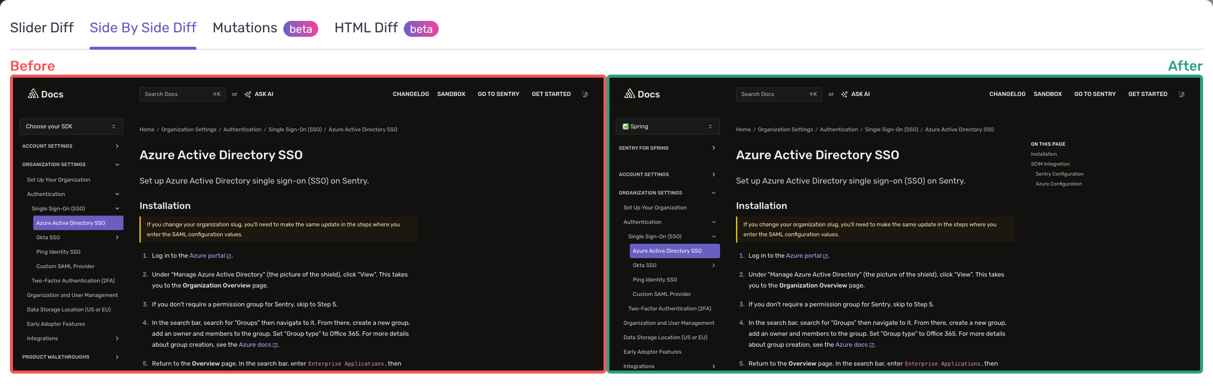 Hydration errors represent a mismatch between the server-rendered HTML, and the client-rendered HTML. So it's beneficial to compare the before and after state of a webpage to understand what's changed, and decide how to make those two states consistent. To do this, we provide a few diff tools to see the differences -- both visually and by looking at the rendered HTML itself.