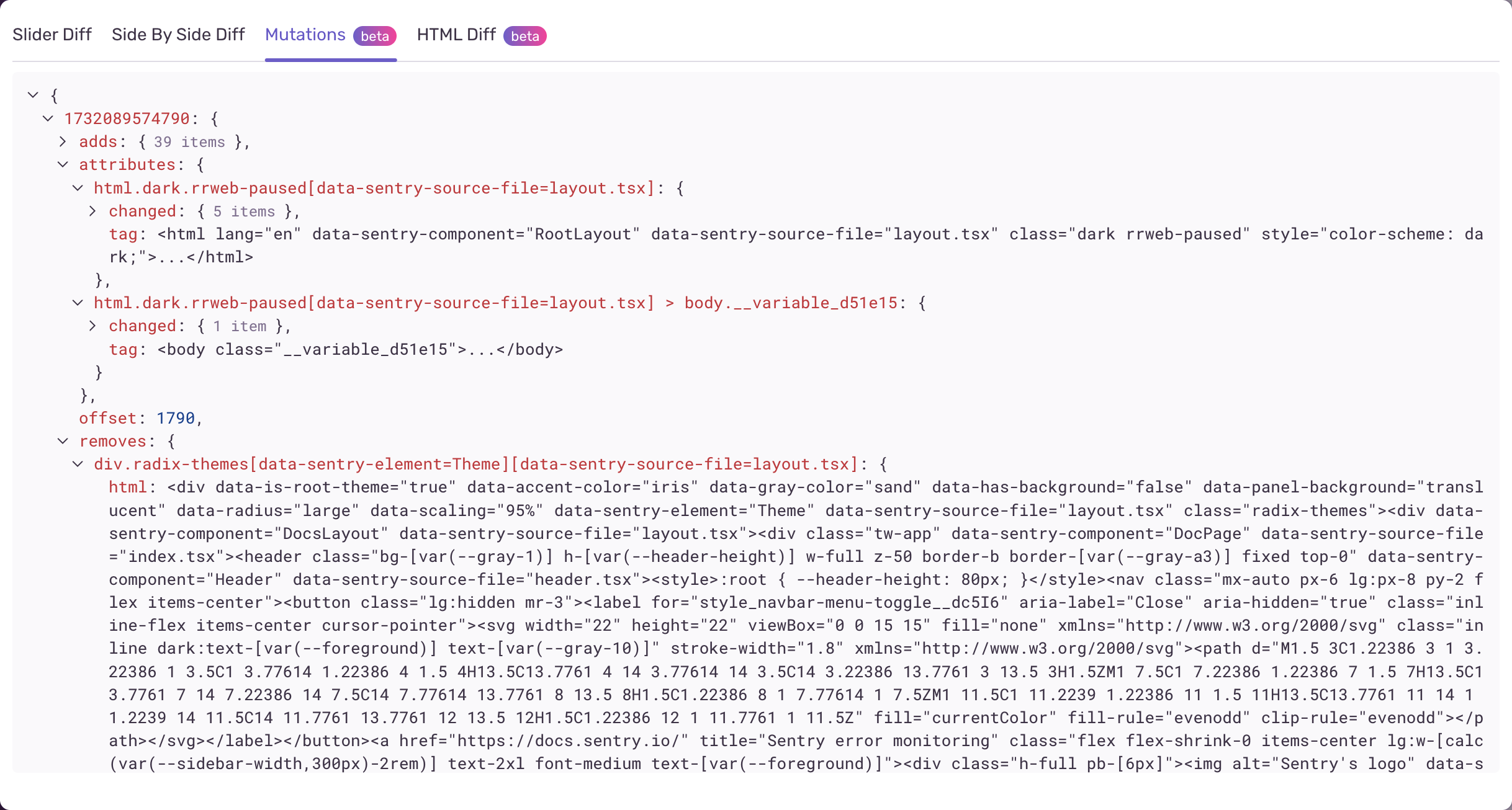 You can see each change to the page, and when it happened within the context of the hydration error. In this case one mutation happened at the timestamp 1732089574790 which was at time offset 1790, or 1.7 seconds since the start of the captured replay. Within this mutation 39 nodes were added, 2 nodes had some attributes changed, and 4 nodes were removed.